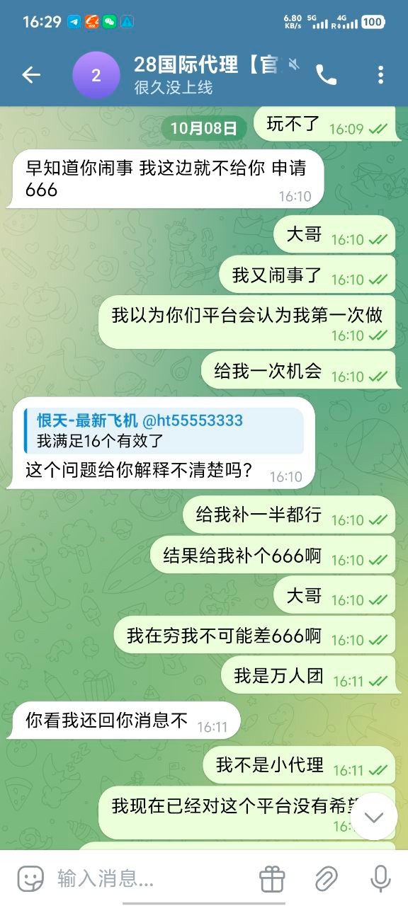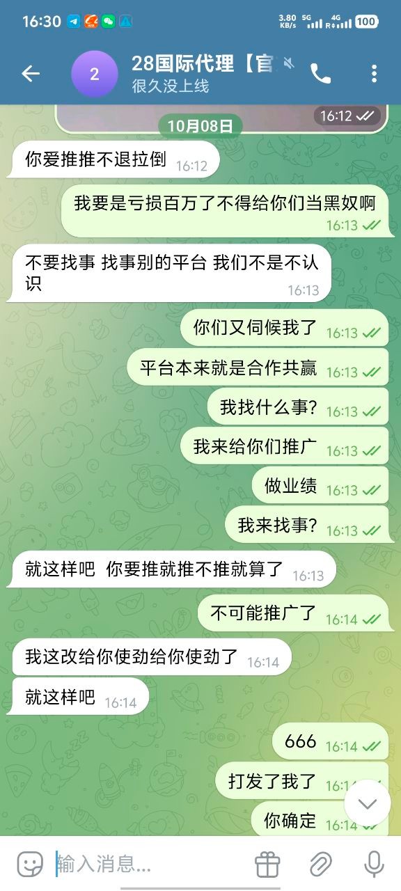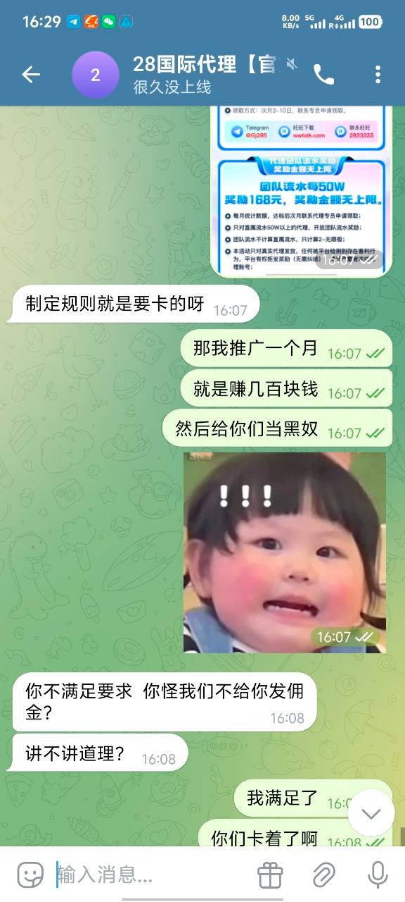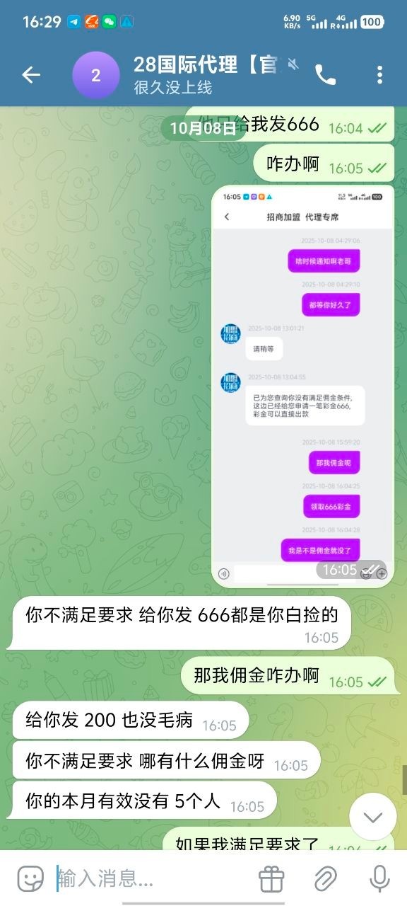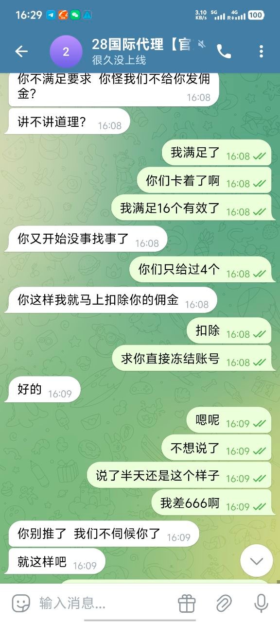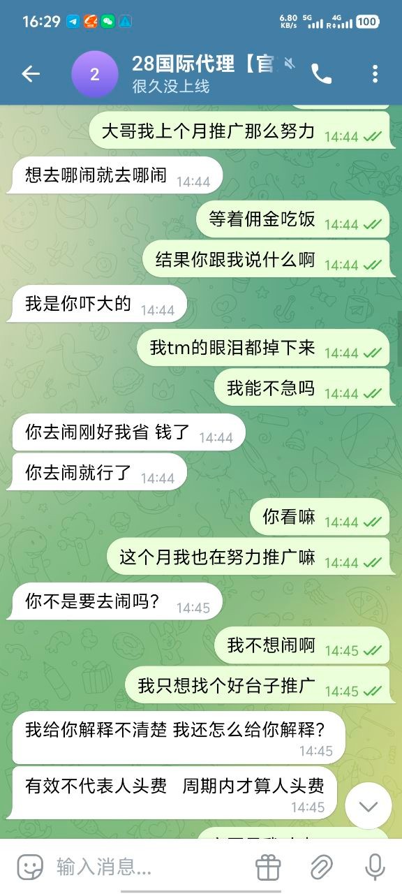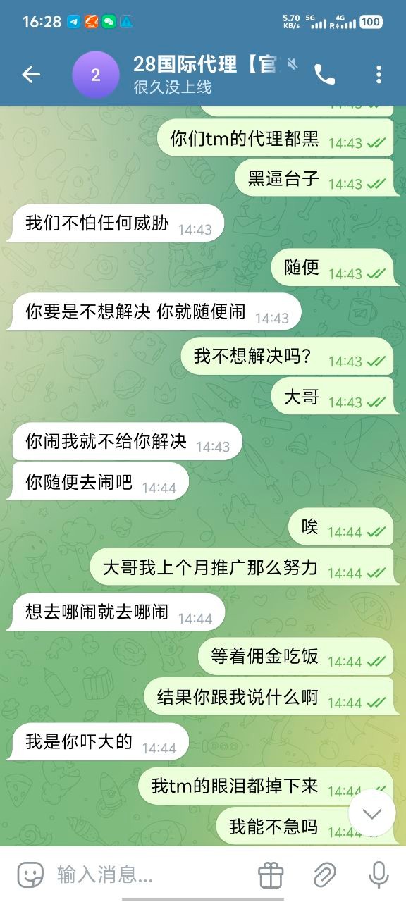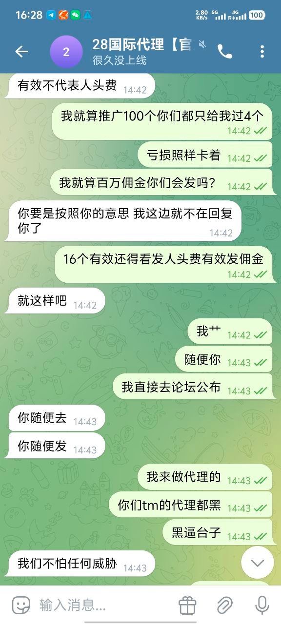 我现在只想在论坛曝光他们,666彩金我也不要了 ,避雷大哥嘛,真心的,无论代理还是玩家都不要去28国际玩,只要去了她家做代理基本就是黑奴,别想给你算佣金算人头费,然后客服也是不要逼脸,我已经放弃希望了。没有选择好平台,在一个垃圾平台把自己做夸了。