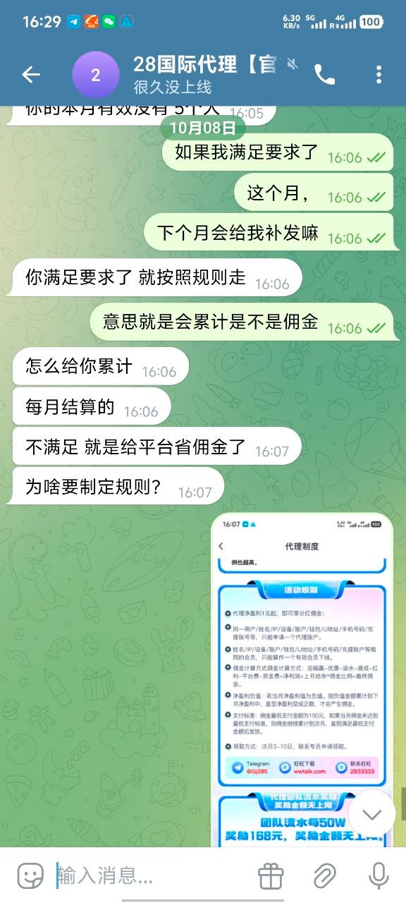 本月有效16个,23w亏损不发放,说不满足5个有效,然后补发666佣金,佣金不累计,平台光明正大说吃了,按照实际发放输了4个人头费算,本来玩家输了6w有个玩家出款8000应该出款的,说他玩28游戏犯规给他钱罚没了,我想的是罚没了,很多玩家出款1w左右无论电子还是彩票,必黑。